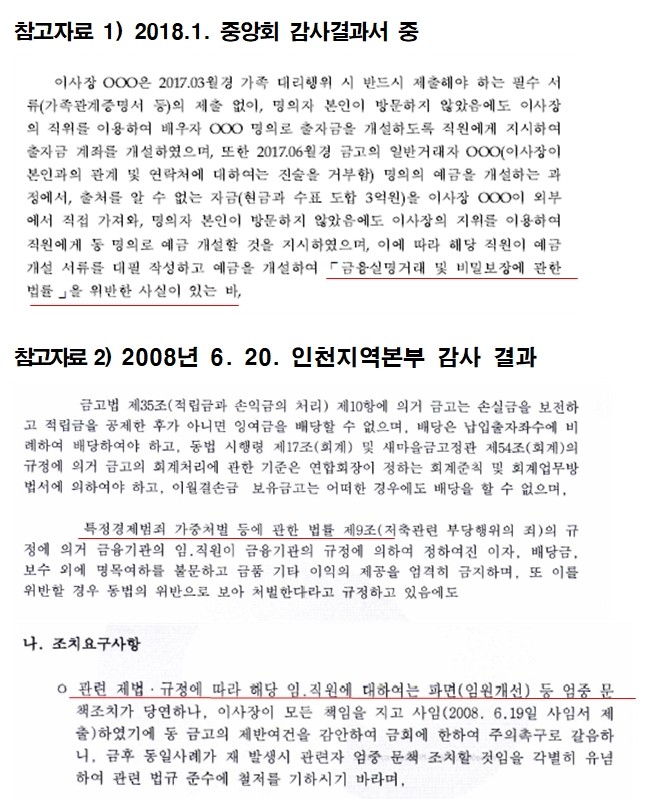 이 의원에 따르면 민 이사장은 지난해 새마을금고 중앙회 감사자료에 금융실명법 위반한 내용이 고스란히 적시돼 있음에도 실제 국감 현장에서는 이같은 위반 사실이 없다고 단호히 부정했다.