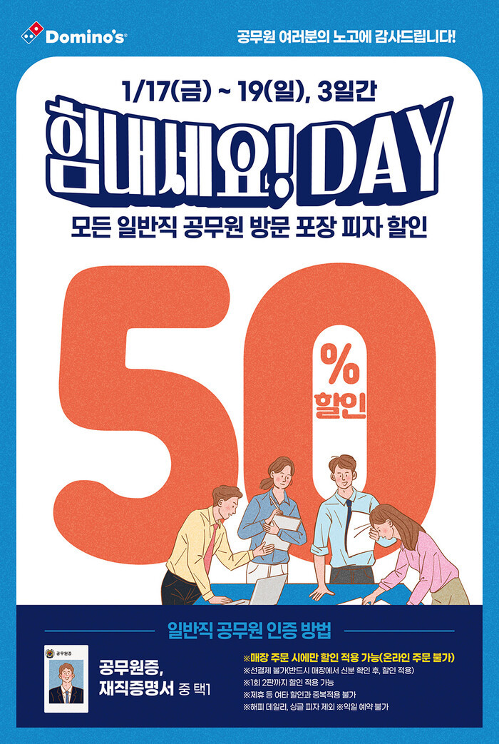 ‘힘내세요! DAY’는 국민들을 위해 애쓰는 일반직 공무원을 위한 프로모션으로 오는 17일부터 19일까지 오프라인 매장 방문 포장 시 모든 피자 반값 할인 혜택을 제공한다. 이번 행사의 혜택은 1회 2판까지 적용 가능하며 제품 수령 시 매장에서 공무원증 혹은 재직증명서를 통한 신분 확인 후 이용할 수 있다.(자세한 내용은 도미노피자 홈페이지 참조)