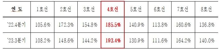 ▲ 호선별 혼잡도 현황(’23.3분기 기준) (표=서울시) |