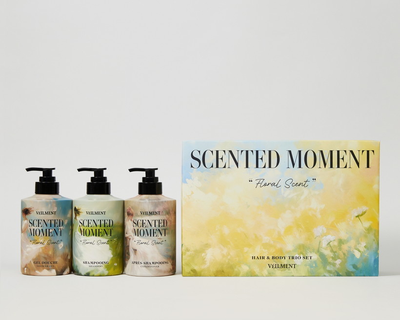 우선 센티드 모먼트 ‘플로럴 세트’는 샴푸 415ml와 컨디셔너 415ml, 바디워시 415ml로 구성했다. 특히 바람에 날리는 플로럴(꽃) 향기를 담은 센티드 모먼트 라인의 콘셉트를 그대로 구현해낸 클래식한 패키지 디자인이 돋보인다.