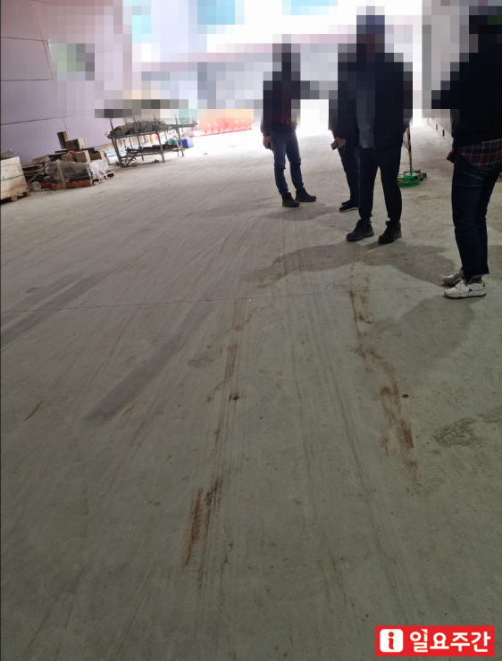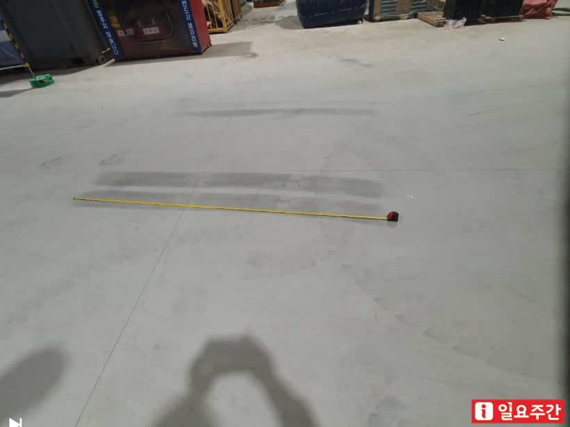▲지난 4일 오전 11시경 신세계건설이 시공 중인 경기도 광주시 오포읍 오포물류센터 신축공사 현장에서 안전사고가 발생해 협력업체 환승이엔지 설비 팀장 A씨가 한쪽 다리를 절단하는 사고를 당한 사고 현장으로, 지게차의 브레이크 자국이 선명하다.(사진=제보자 제공) |