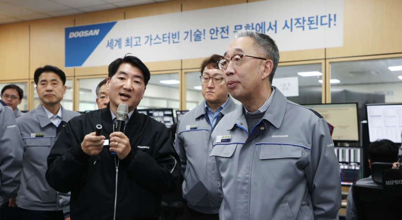 두산에너빌리티는 박지원 회장, 파워서비스BG 손승우 부사장을 비롯해 ㈜두산 CSO 김도원 사장, CFO 김민철 사장 등 주요 경영진이 참석한 가운데 창원 본사에서 가스·수소터빈 제작 현장 방문 행사를 가졌다고 7일 밝혔다.
