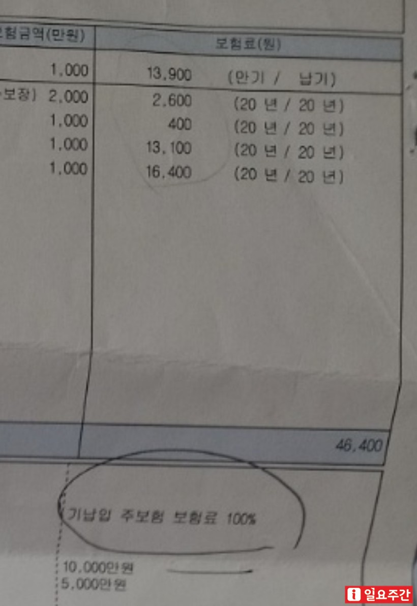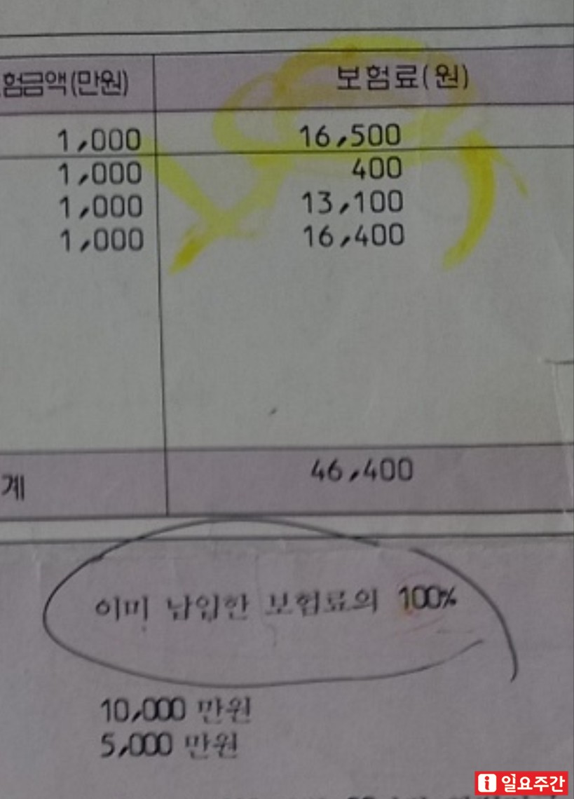 | ▲제보자 A 씨가 2000년 상해보험 가입 때 받은 보험증권에는 총납입 보험료 4만 6400원 중에 주계약 보험료는 16500원이다. 또한 만기축하금 관련 '이미 납입한 보험료의 100%'를 환급 해준다고 되어 있다.(제보자 제공) |