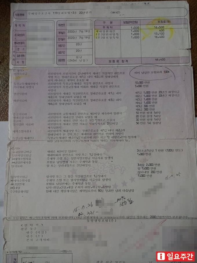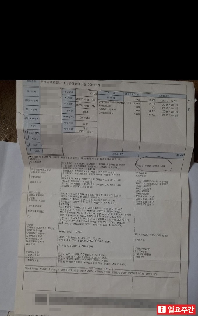 | ▲제보자 A씨가 2000년 상해보험 가입 때 받은 보험증권.(제보자 제공) |