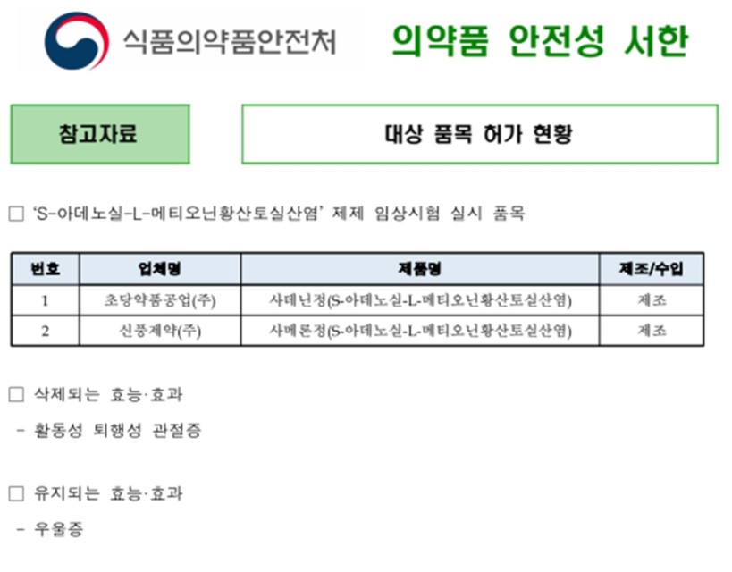 앞서 식약처는 우울증과 활동성 퇴행성 관절증에 사용되는 S-아데노실-L-메티오닌황산토실산염 성분 제제의 효능·효과 중 ‘우울증’에 대해서는 유효성이 입증됐지만 활동성 퇴행성 관절증에서는 유효성 확인이 필요하다고 판단해 임상시험 재평가를 했다.