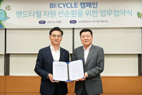 전날 광화문에 위치한 교보생명 본사에서 열린 협약식에는 두 회사의 대표이사 사장이 함께 참석한 가운데 이뤄졌다. 이를 통해 양 사는 '바이사이클(BI:CYCLE) 캠페인'에 참여, 친환경 경영과 자원 순환 환경 조성에 앞장서기로 했다.