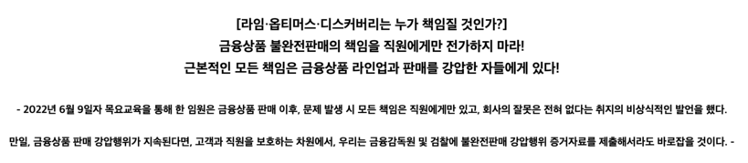 오병화 대신증권지부장은 “직원 대다수는 회사가 금융상품 판매 강압행위를 했고, KPI 달성률 제고·인사발령 시 불이익을 감안해 어쩔 수 없이 금융상품을 팔았을 뿐이라는 의견을 주셨다”며 “이런 상황에서 모든 책임을 판매 직원에게만 전가해 직원의 삶이 피폐해진다면, 금융상품을 팔 이유가 전혀 없다. 향후에는 회사의 판매 강압행위에 대한 증거자료를 확보하자라는 의견까지 제시됐다”라고 사내 구성원들의 생각과 불만을 전했다.
