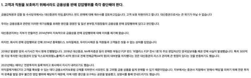 그러면서 “하지만, 회사의 판매 강압행위로 인해 2014년 종목형ELS, 브라질채권, 우리다시채권 등 직원들과 고객들은 씻을 수 없는 상처를 입었다”며 “2018년 발생한 양곡 사기사건 역시 현재 진행형이다. 2018년 대신증권, NH투자증권 등이 판매한 부동산 P2P 펀드 ‘피델리스 P2P 전사 1호’의 주요 편입자산인 양곡담보대출 채권 연체 사실이 발생했다. 특히, 300억 원 이상 투자한 대신증권의 단일 익스포져(위험노출액)가 40억 원으로 전체 연체금액(44억 원)의 대부분을 차지했다는 것은 대신증권의 리스크 관리에 큰 허점이 있다는 것을 반증하기도 했다”라면서 그간 강압행위로 인한 문제점을 지적했다.
