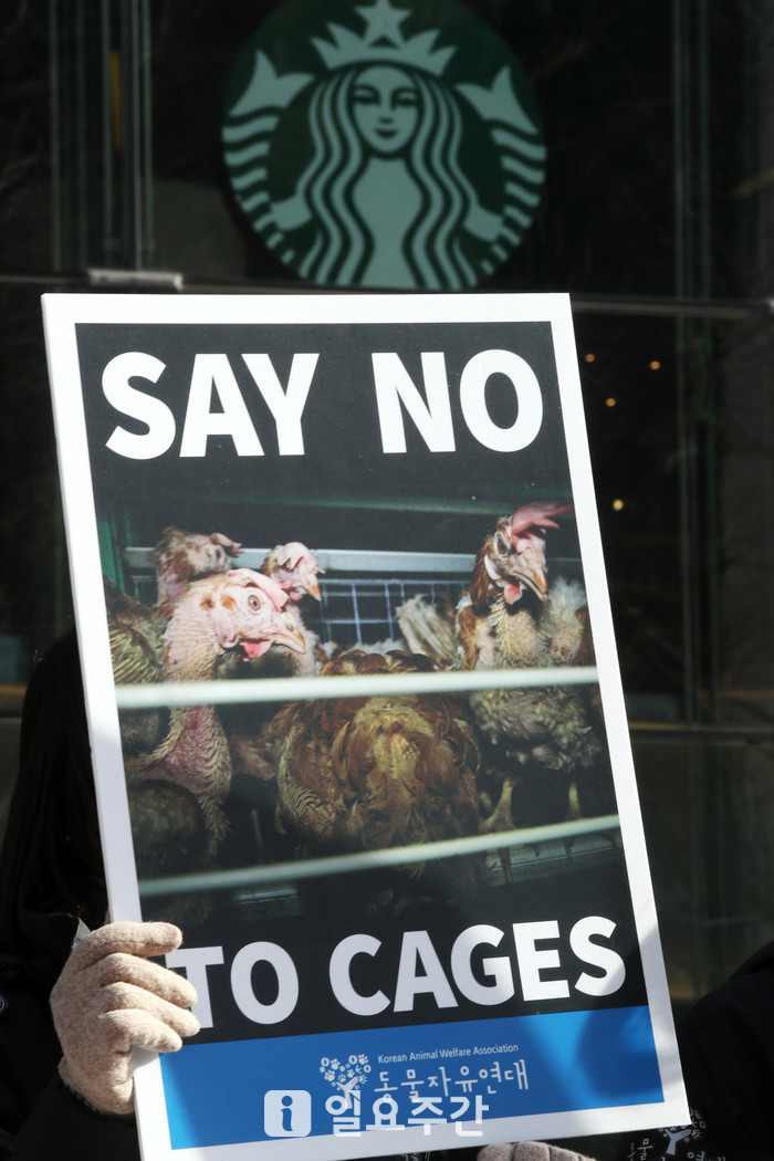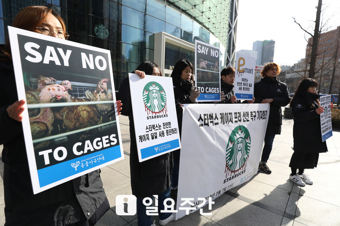 7일 동물연대는 서울 종로구 스타벅스 더종로R점 앞에서 ‘스타벅스 케이지 사용중단 기자회견’을 열어 스타벅스코리아가 케이지프리 선언에 동참할 것을 촉구했다. 케이지프리 선언은 닭을 A4용지보다 작은 닭장 안에 가두고 달걀을 생산하게 하는 공장식 축산 방식으로 생산된 달걀의 사용을 금지해야 한다는 것이다.