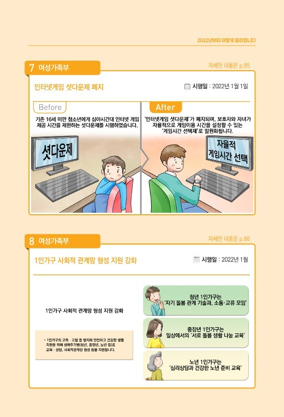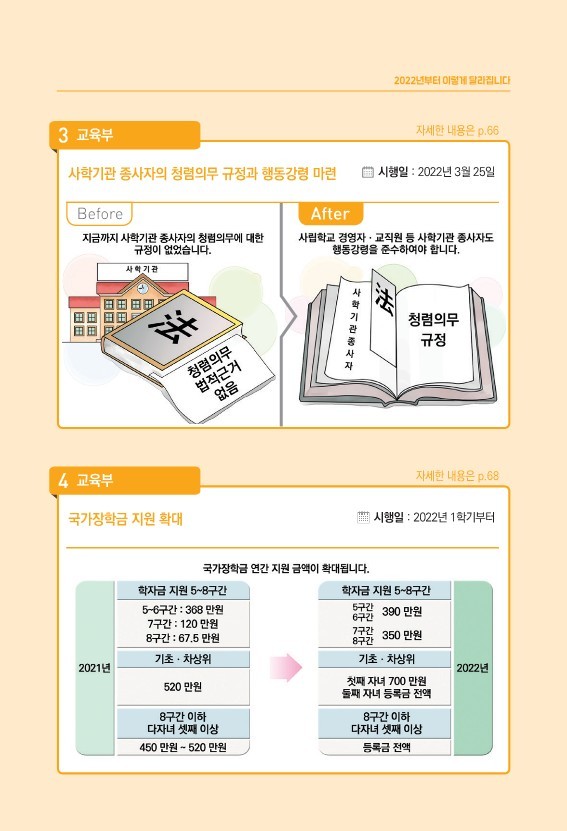 기획재정부는 새해부터 달라지는 제도와 법규사항 등을 알기 쉽게 정리한 ‘2022년부터 이렇게 달라집니다’ 책자를 발간했습니다. 이 책자에는 39개 정부기관에서 취합한 304건의 정책이 분야·시기·기관별로 구성됐고 주요 내용은 삽화로도 제시했습니다. 본지는 분야별 주요내용을 배포된 삽화와 텍스트를 정리해 카드뉴스 형식으로 정리해보았습니다. [편집자주]