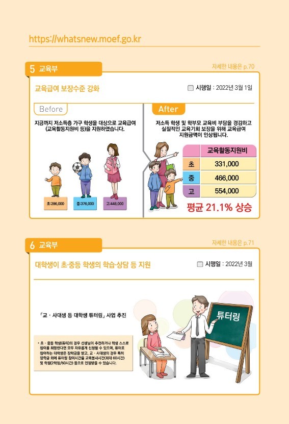 ▲3월부터는 저소득가구 학생에 대한 교육급여 지원금액도 인상됩니다. 초등 33만1000원(+4만5000원), 중등 46만6000원(+9만원), 고등 55만4000원(+10만6000원)입니다.
