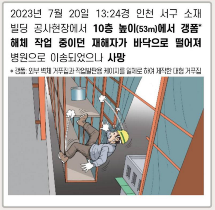 [일요주간 = 이수근 기자] 지난 20일 오후 1시 24분경 (주)준서예건이 시공 중인 인천 서구 소재 주안비즈타워 지식산업센터 공사현장 10층 높이(53m)에서 갱폼 해체 작업중이던 건설노동자 A 씨가 바닥으로 추락해 병원으로 이송됐으나 사망하는 사고가 발생했다.