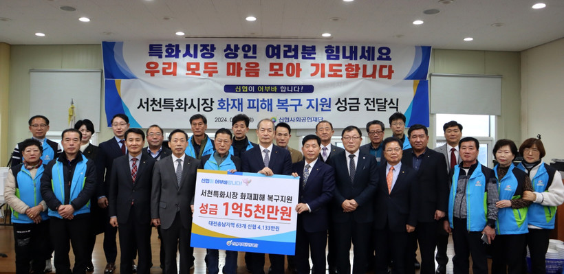 신협재단은 지난 15일 신협중앙회, 대전.충남지역 63개 신협과 협력해 마련한 1억 5000만 원의 성금을 서천특화시장 상인회에 기탁했다.