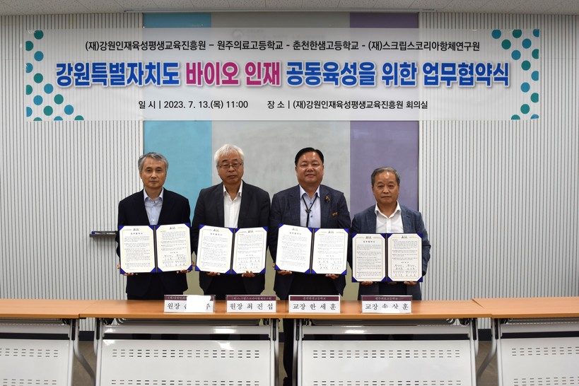 [일요주간=김영란 기자] (재)강원인재육성평생교육진흥원(원장 손인주)은 7월 13일(목) 재단 회의실에서 원주의료고등학교, 춘천한샘고등학교, (재)스크립스코리아항체연구원과 ‘도내 바이오 분야 인재육성’을 위한 업무협약을 체결했다.