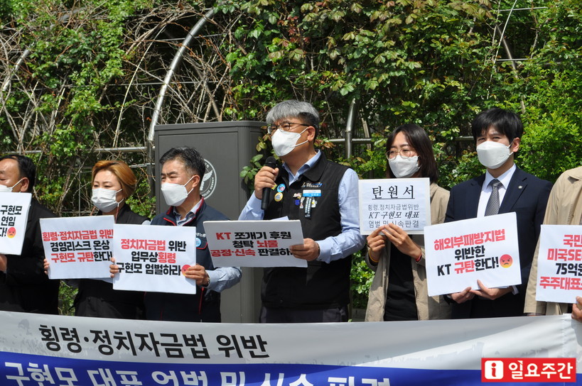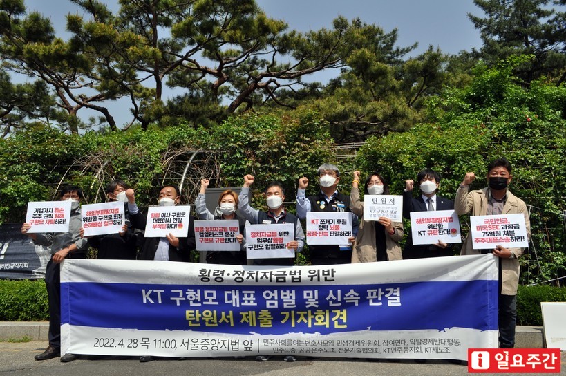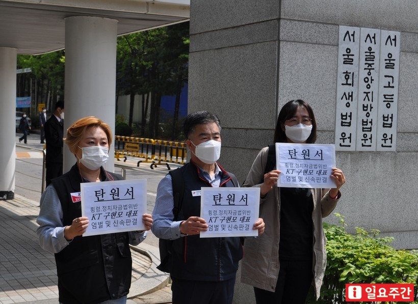 [일요주간 = 성지온 기자] 노동계와 시민사회단체가 횡령 및 정치자금법 위반 혐의를 받는 구현모 KT 대표 외 경영진들에 대해 신속한 판결을 요청하는 탄원서를 법원에 제출했다. 이들은 구 대표가 오는 12월 연임을 목표로 고의적인 시간 끌기를 하고 있다면서 통신의 공공성 회복을 위해서 엄중 처벌이 필요하다고 목소리 높였다.