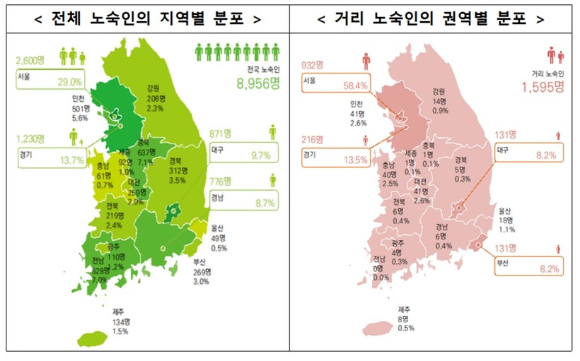 지역별로는 전체 노숙인의 48.4%(4331명)가 수도권에서 생활했다. 특히 거리 노숙인 74.6%(1189명)가 수도권에 집중됐다.