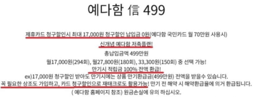 홈쇼핑사들은 예다함 상품이 357회 납부 기준으로 월 1만 4000원이지만 제휴카드인 KB국민카드를 월 70만원 이용하면 1만 7000원이 할인되기 때문에 실질적으로 납부해야 하는 금액은 없다고 방송했다.