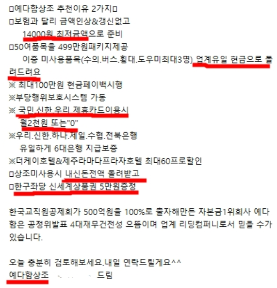 | ▲ 예다함 상조에서 A씨에게 보낸 문자메세지로 내용을 보면 카드사 제휴 시 상조 납입금이 '0'라며 소비자들을 현혹시키고 있다. |