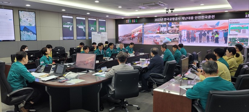 | ▲ 지난 10월, 김포공항에서 진행된 재난대응 안전한국훈련 현장_윤형중 한국공항공사 사장(왼쪽으로부터 첫 번째)이 본사 상황실에서 훈련을 주재하고 있다. (사진=한국공항공사) |