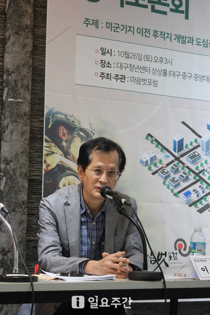 [일요주간 = 이재윤 기자] 지난 25일 대구청년센터 상상홀에서 ‘마음벗포럼’ 주최 ‘미군기지 이전 관련 정책토론회’가 열렸다. 장재홍 마음벗포럼 사무총장의 사회로 진행된 이날 토론회는 이대영 코리아미래연구소 소장의 주제발표를 시작으로 대구남구의회 ‘미군부대대책특별위원회’ 위원장을 맡고 있는 더불어민주당 정연우 남구의회 의원, 마음벗포럼 공동대표 이상호 경북대 교수, 그리고 더불어민주당 대구 중남구지역위원장을 맡고 있는 이재용 前 환경부장관이 토론자로 참여해 열띤 토론을 진행했다.