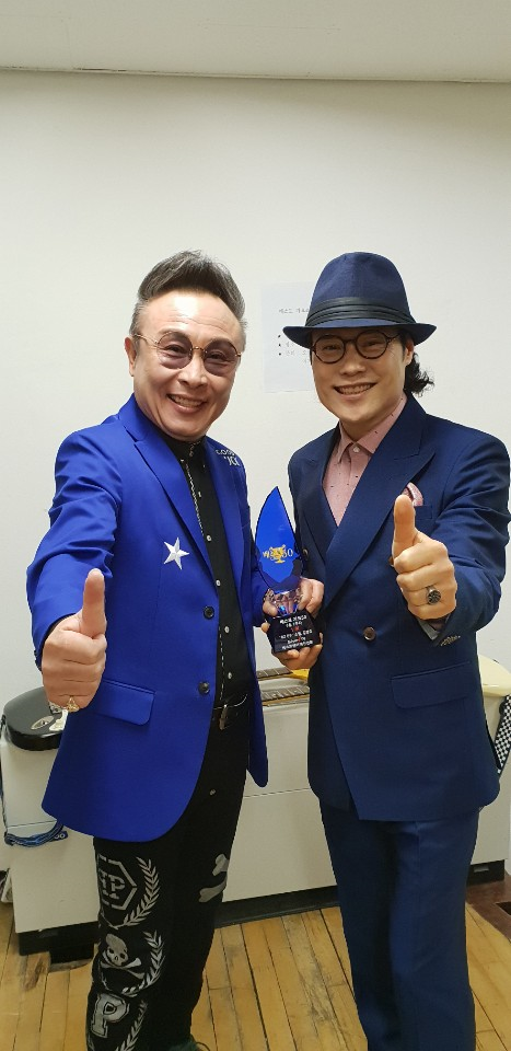 ▲ 최고 친구_를 콜라보로 부른 김정호 천재작곡가 겸 가수와 가수 소명 씨가 가요베스트50에서 연속 4번 1위를 한 후 수상기념사진 |