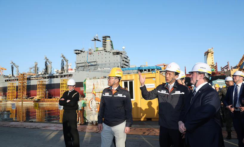 이날 필린 장관은 김 부회장의 안내로 미국 해군 제7함대 소속 급유함 '유콘(Yukon)'함의 유지·보수·정비(MRO) 작업 현장을 직접 둘러봤다. '유콘'함은 지난해 11월 한화오션이 수주해 현재 정비 중이며, 오는 6월 출항을 앞두고 있다. 이 외에도 잠수함 및 상선 건조 구역 등 주요 생산 시설도 함께 시찰했다.