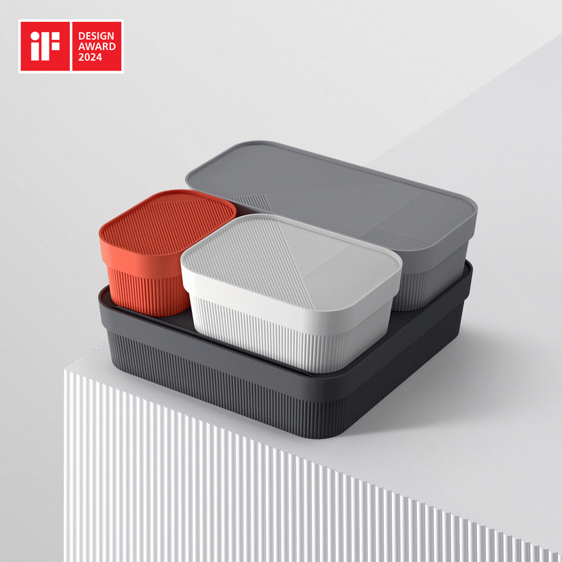 ‘에코용기’는 ‘음식(Food)’ 분야 중 ‘패키징(Packaging)’에서 수상했다. 특히 크기와 용량이 다른 사각 그릇 4개가 하나의 모듈(module)로 조립되도록 디자인 해 배달의 안정성을 높인 점이 인정 받았다. 또한 용기별 색상을 다르게 제작해 바쁜 음식점 주방에서 색상을 통해 용기의 종류를 쉽게 인지할 수 있도록 한점도 눈길을 끌었다.