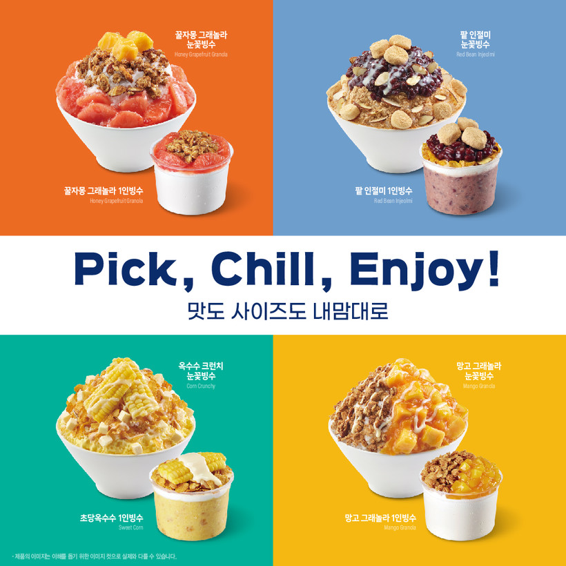 이번 시즌에는 기존의 1인 빙수 3종, 눈꽃 빙수 2종에서 각각 4종으로 제품을 확대하며 선택의 폭을 넓혔다. 특히 동일한 맛을 두 가지 타입으로 즐길 수 있어 소비자 취향에 따라 다양하게 선택할 수 있다는 점이 특징이다.
