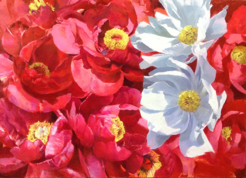 ▲ 이일훈 화백! 모란의 활짝 핀 순간, 그 숨 막히는 절정의 순간을 붉은꽃과 흰꽃을 상호 교차시켜 역동적으로 표현하였습니다. |