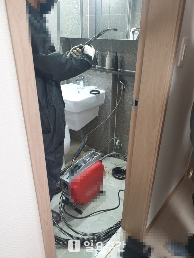 ▲욕실 화장실 변기에서 역류가 발생해 건설사에서 사설 업체를 불러 긴급 복구 중인 장면.(사진=제보자 제공) |