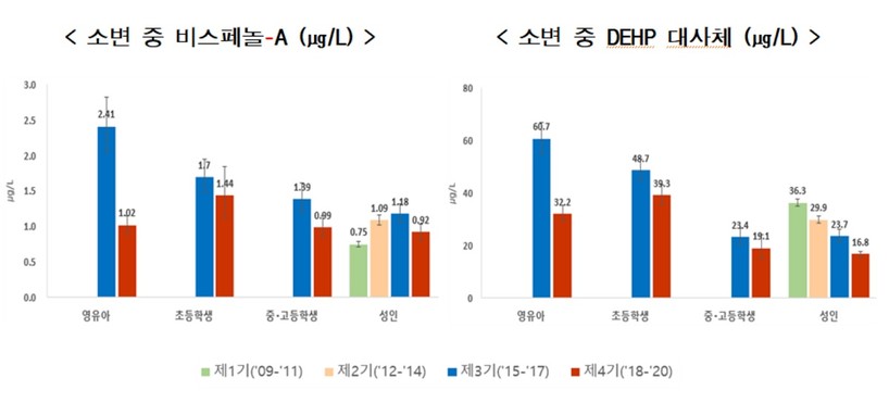 플라스틱 가소제로 사용하는 프탈레이트(디에틸헥실프탈레이트 대사체)의 소변 중 농도는 ▲영유아 32.2㎍/ℓ ▲초등학생 39.3㎍/ℓ ▲중고등학생 19.1㎍/ℓ ▲성인 16.8㎍/ℓ로 모든 연령대에서 3년 전보다 감소했고, 중고등학생 이하 연령층에서 농도가 높은 경향을 보였다.