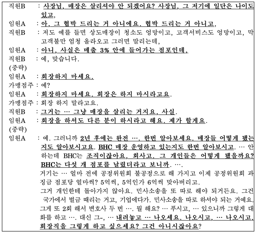 이후에도 임원 A 씨와 직원 B 씨는 가맹점주에게 BHC가 5개 가맹점과의 가맹계약을 해지한 사례를 예시로 들며 가맹점주가 가맹점 운영을 계속하기 위해서는 점주협의회 회장직을 사임해야 함을 반복적으로 주지시켰다.