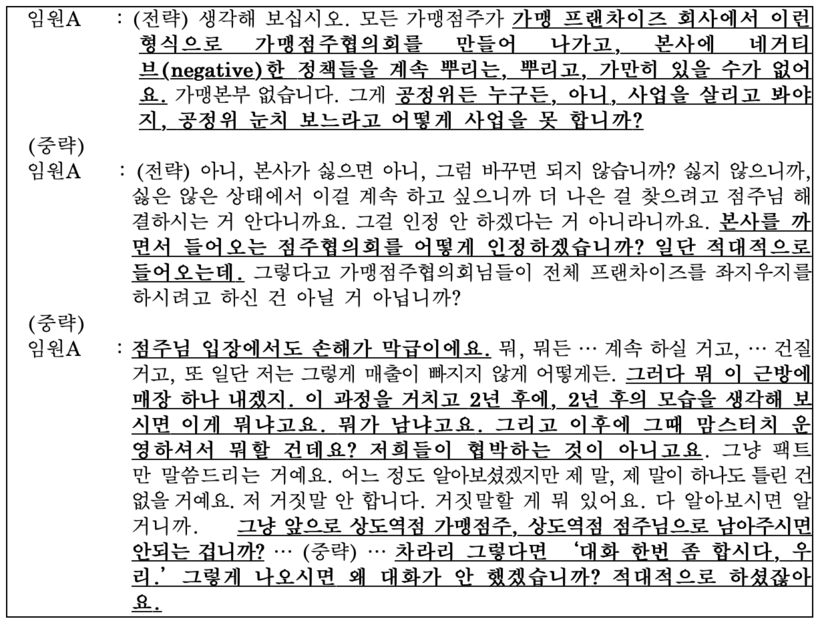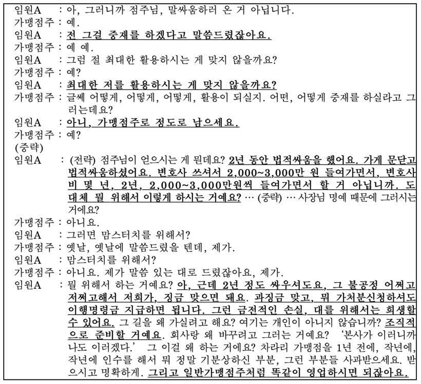 임원 A 씨는 가맹점주에게 점주협의회와 같이 본사에 부정적인 정책을 뿌리는 것에 가만히 있을 가맹본부는 없고 이러한 적대적인 태도 때문에 본사가 점주협의회를 인정하거나 대화를 하지 아니한 것임을 밝히면서 재차 '상도역점 점주로 남아줄 것'을 요구했다.