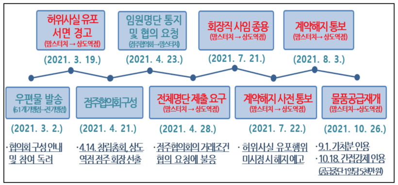 아울러 계약해지 통보 당일 자사 온라인 시스템에 '가맹점주협의회를 참칭하는 단체로부터 발송된 우편물에 담긴 허위정보', '분쟁조정신청서 작성은 본부와 가맹점주의 상생 발전을 저해하는 행위', '상도역점의 경우 매우 높은 수준의 매출을 내고 있는 매장임에도 불구하고 본부를 끊임없이 비난하며 갈등을 조장' 등 점주협의회 및 상도역점 가맹점주에 대해 부정적인 내용을 기재한 공지문을 게시했다.
