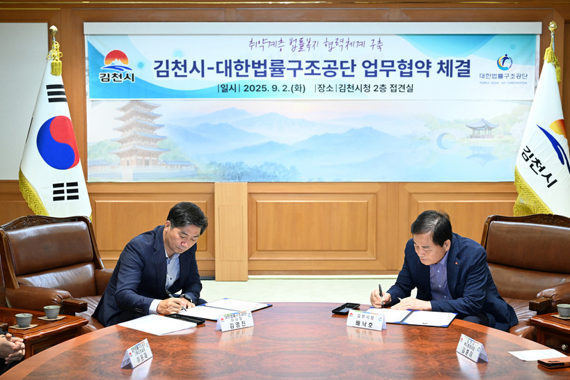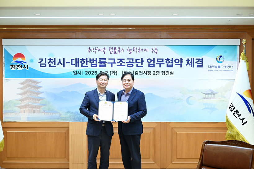 [일요주간=최부건 기자] 김천시(시장 배낙호)는 지난 2일 대한법률구조공단(이사장 김영진)과 함께 취약계층 법률 복지 협력체계 구축을 위한 「희망법률동행」 업무협약을 체결했다.
