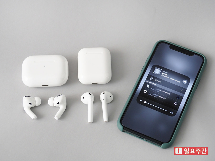 ▲1세대 에어팟과 애플 에어팟 프로, 동시에 연동 가능 (사진=지혜수 기자)