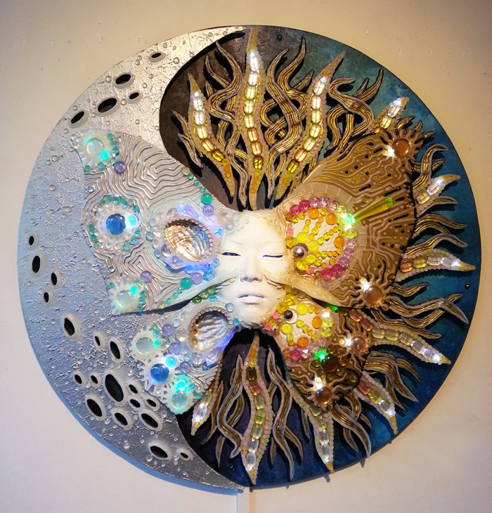| ▲ 최규식-하루나비(day and night, Butterfly) 해(日)와 달(月)을 나비의 날개로 표현하였고 가운데에는 여인의 얼굴을 형상화 하였다. 그리워하는 그 여인은 하루를 어떻게 보낼까 하는 마음을 나비에 비유하여 내게 다시 날아와 주기를 바라는 바램을 표현하였다. |