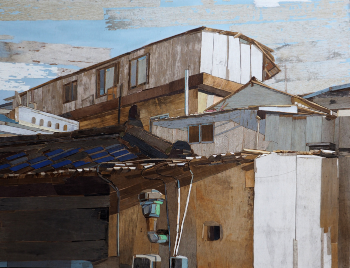 | ▲ 이부강 옮겨진 풍경(moved landscape) 깎고 덧붙이는 과정을 통해 어린 시절의 기억이 담긴 동네의 모습을 재현하고 기록한다. 이는 개발이 중단된 곳인 동시에 우리들의 추억 속에서 시간이 멈춘 곳이기도 하다. 낡고 빛바랜 동네의 모습을 보면 개개인이 저마다 가지고 있던 내러티브를 떠오르게 한다. 나무판위로 '옮겨진 풍경'은 현실에선 사라진 풍경일 수 있다. 하지만 조각 하나하나에 그 동네의 숨결이 담겨 있어 감상자의 기억의 관념을 이끌어 내 무한히 존재하게 된다. |