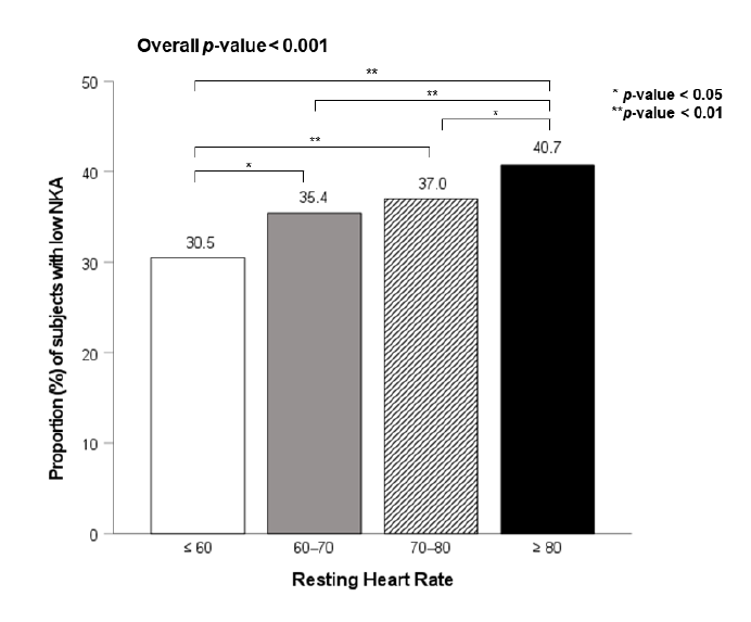 안정 시 심박수에 따라 4개의 그룹(≤60 bpm, 60-70 bpm, 70-80 bpm, ≥80 bpm.)으로 분류한 뒤 대사질환 및 염증 지표, NK세포 활성도 등을 관찰했다. 그 결과 안정 시 심박수가 빠르면 대사질환 및 염증 관련 지표가 높았고 안정 시 심박수가 비교적 빠른(70-80 bpm, ≥80 bpm) 그룹은 낮은(≤60 bpm) 그룹보다 NK세포 활성도가 낮은 경향을 보였다. 안정 시 심박수가 빠를수록 체내 염증 지표가 높고 면역력이 떨어지는 환자 비율이 높을 수 있다는 의미이다.