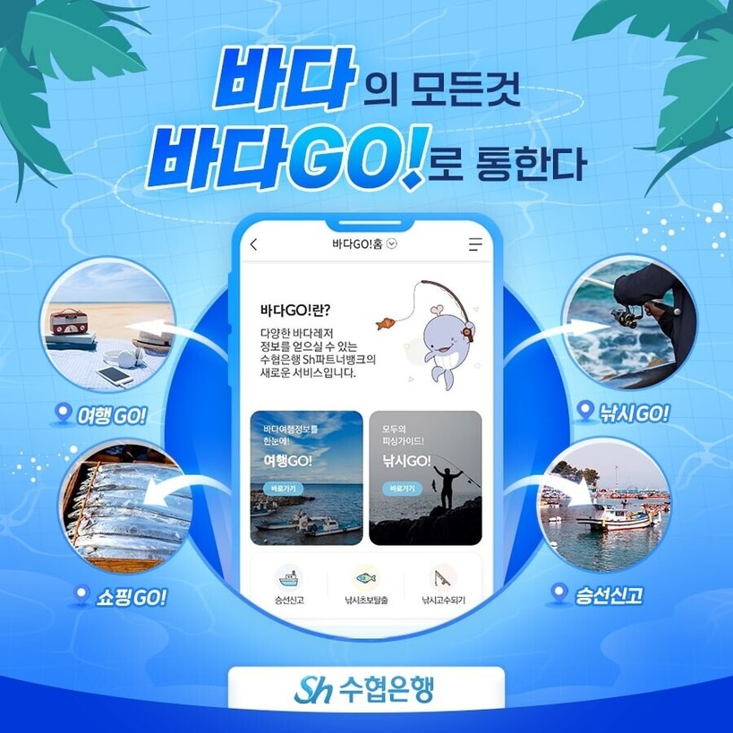 | ▲ Sh수협은행(은행장 강신숙)은 22일, 모바일뱅킹앱「파트너뱅크」를 통해 해안 관광과 낚시 정보, 수산물 쇼핑 등 바다여행 관련 통합 정보를 제공하는 ‘바다GO!’ 서비스를 오픈했다.(이미지=Sh수협은행) |