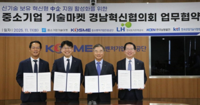 [일요주간=엄지영 기자] 한국토지주택공사(LH)는 11일 중소벤처기업진흥공단 본사에서 「중소기업기술마켓 경남혁신협의회」 업무협약을 체결했다고 밝혔다. 이번 협약은 우수 신기술을 보유한 중소기업의 판로 확대와 성장 지원을 강화하기 위해 마련됐다. LH를 비롯해 중소벤처기업진흥공단, 한국남동발전(KOEN), 한국산업기술시험원(KTL) 등 경남 혁신도시 4개 기관이 참여해 중소기업 지원 협업 체계를 구축했다.