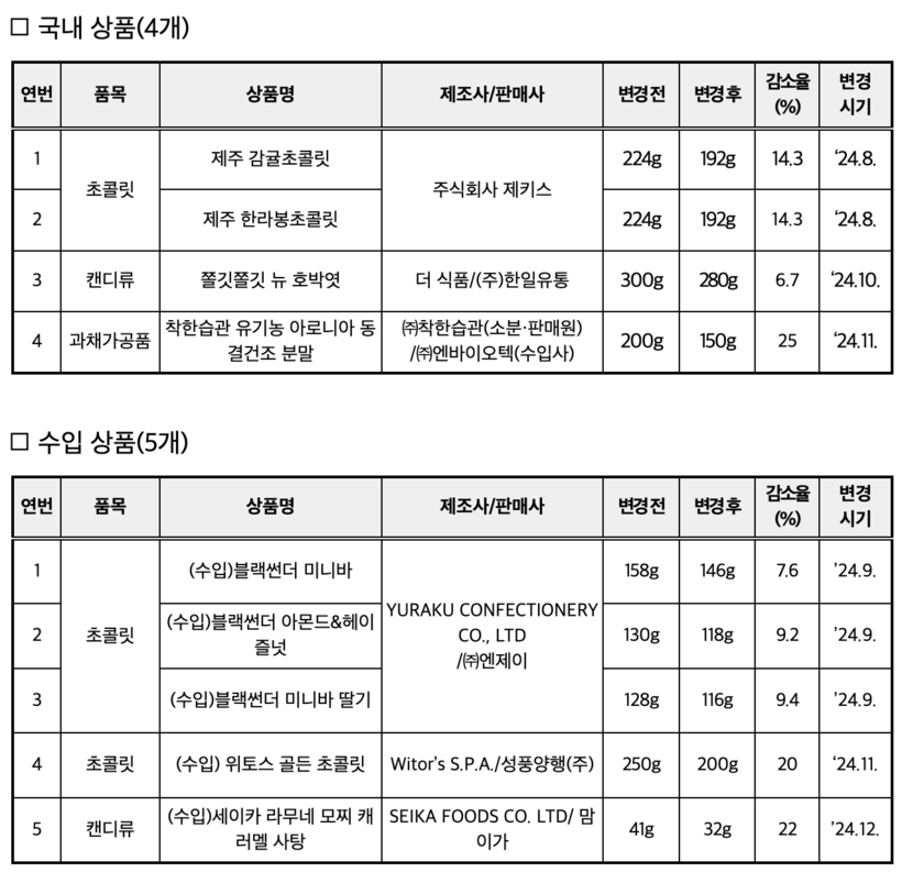 지난해 4분기 슈링크플레이션 모니터링 결과 9개 상품 용량 줄였다