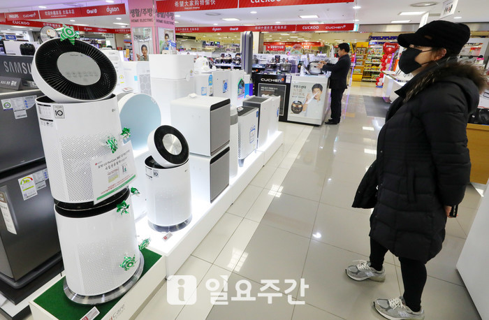 | ▲사상 초악의 미세먼지로 인해 비상점감조치가 발령되는 등 미세먼지 공습이 계속되며 공기청정기와 마스크 등 관련용품 판매량도 증가하고 있다. 사진은 가전제품 판매 매장에 진열된 공기청정기 제품들. |
