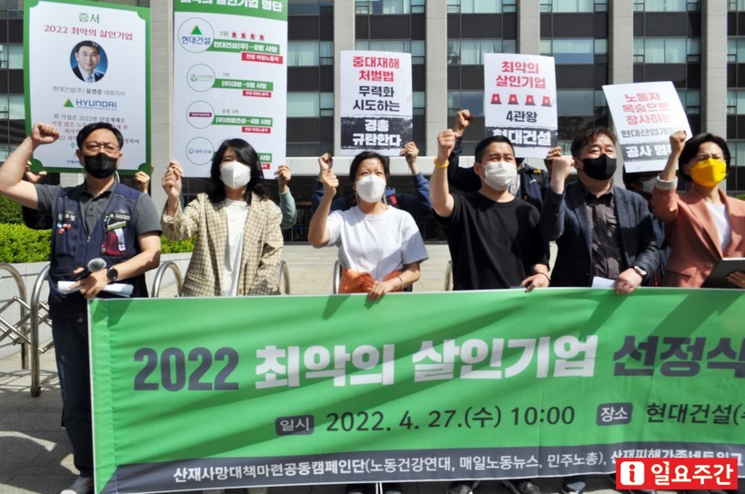 한편, ‘산재사망대책마련 공동캠페인단’, 산업재해피해가족네트워크 ‘다시는’ 등 노동계와 시민사회단체는 이날 국토부의 올해 1분기 건설 현장 사망자 발생 현황 발표에 때맞춰 지난해 산업재해로 사상자를 가장 많이 낸 ‘최악의 살인기업’을 선정하는 기자회견을 개최해 주목을 받았다.