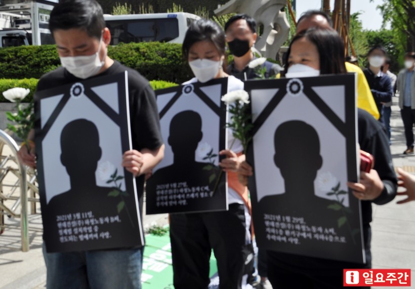 ▲산재피해가족네트워크 다시는 관계자들이 27일 오전 서울 종로구에서 진행된 2022 최악의 살인기업 선정식에서 일하다 산재 사고로 숨진 노동자들을 추모하는 퍼포먼스를 했다. <사진=성지온 기자> |