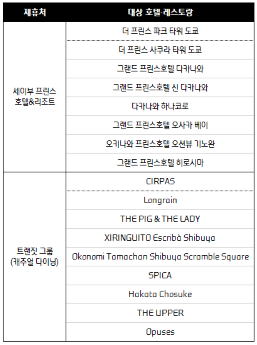 대상 호텔은 도쿄, 오사카, 오키나와, 히로시마 등 일본의 대표 관광 도시 4곳, 8개 특급 호텔이다. 주요 호텔은 도쿄타워 전망으로 한국인에게 잘 알려져 있는 ‘더 프린스 파크타워 도쿄’, 테마파크와 수족관 등 오사카의 대표 관광지들과 인접한 ‘그랜드 프린스호텔 오사카 베이’, 바다를 감상할 수 있는 오션뷰 테라스와 인피니티풀로 잘 알려진 ‘오키나와 프린스호텔 오션뷰 기노완’, 히로시마의 세토 내해 자연 경관을 전 객실에서 감상할 수 있는 ‘그랜드 프린스호텔 히로시마’ 등이다.