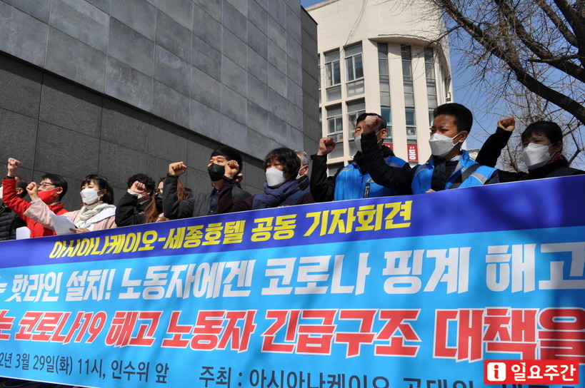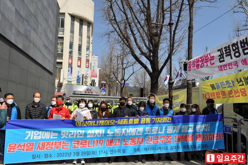 아시아나케이오·세종호텔 공동대책위원회는 29일 서울 종로구 대통령 인수위원회 부근에서 기자회견을 열고 “사회적 재난에 피해 당한 국민을 지원하는 것은 정부 역할이지만 코로나19로 해고 된 노동자들에 대한 대책은 전혀 논의되고 있지 않다”라면서 “윤석열 당선인과 인수위는 코로나 위기 전가 부당 해고 사태를 당장 해결하라”라고 촉구했다. 아시아나케이오·세종호텔 공동대책위원회는 코로나 사태 당시 부당해고 된 아시아나케이오, 세종호텔 노동자들의 연대조직이다.