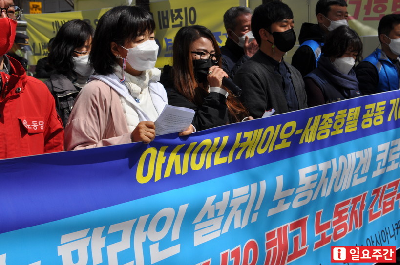 이어 “두 기업은 코로나19 특별고용지원업종 대상으로 휴업수당의 최대 90%까지 지원하는 고용유지지원금 신청이 가능했다. 정부 지원을 통해 일자리를 유지하는 방안이 엄연히 존재했다”라며 “그러나 아시아나케이오와 세종호텔은 고용 유지 지원금 신청을 의도적으로 피했다. 오히려 코로나를 핑계 삼아 인적 구조조정과 노조 탄압을 단행했다”라고 밝혔다.