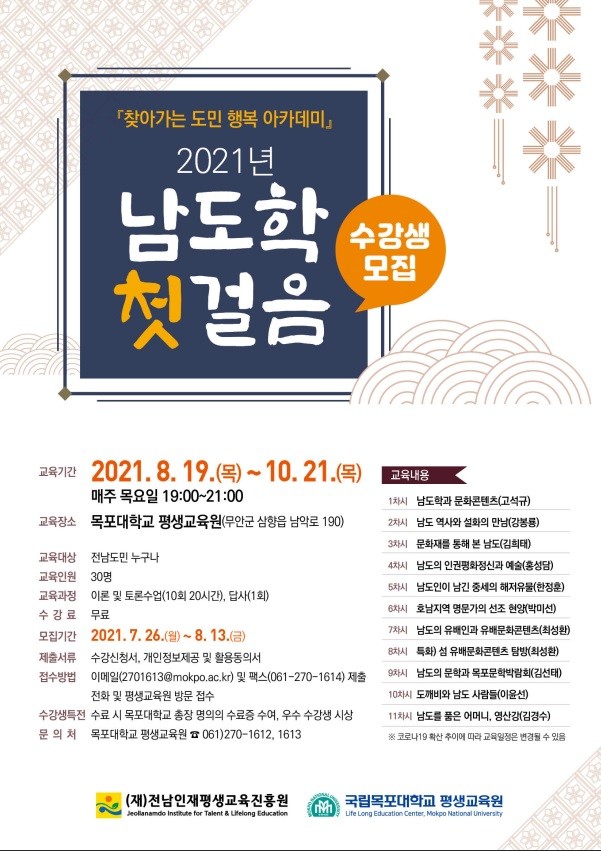 ‘2021년 남도학 첫걸음’프로그램은 지난 8월 19일부터 10월 21일까지 진행될 예정이며 총 수강생 30명으로 수강료는 무료이고 전남도민이면 누구나 수강할 수 있다.