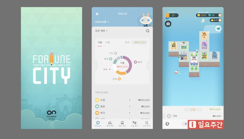 ▲게임과 가계부를 결합한 형태의 파이낸스 앱, 포츈 시티 (이미지 편집=일요주간) |